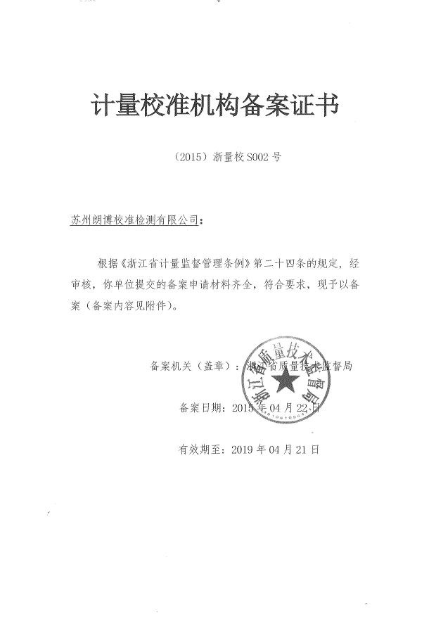 寧波朗博計量檢測有限公司是寧波計量檢測、寧波儀器檢測、寧波儀器校準、寧波計量檢測、寧波儀器校正、寧波儀器計量校驗的計量校準檢測技術服務公司。寧波朗博計量檢測有限公司屬于朗搏校準檢測集團公司,集團公司另外下轄蘇州朗博校準檢測有限公司和北京朗博校準檢測有限公司,另外在南京、揚州、南通、廣州東莞、山東濰坊、安徽合肥、越南北寧等地設置辦事機構。朗博校準檢測集團通過中國合格評定國家認可委員會(CNAS)及國防科技工業實驗室認可委員會(DILAC)認可與授權,專業從事計量校準、檢測(包含軍用設備檢測)和維修服務的綜合實驗室,可以開展900多個項目的校準和檢測技術服務,所出具的校準證書及檢測報告獲得國際實驗室認可合作組織多邊協議(ILAC-MRA)成員中48個國家和地區的認可。校準檢測,實驗室建有幾何量、熱工、力學、電磁、無線電、時間頻率、振動、聲學、光學、理化等專業校準實驗室。實驗室嚴格按照國家相關檢定規程、校準規范、國家標準或儀器說明書技術指標的要求等進行全面的校準檢測;實驗室的校準檢測工作完全滿足ISO/IEC17025和ISO9000的要求,實驗室所出具的第三方公正的校準證書及檢測報告獲得國際實驗室認可合作組織多邊協議(ILAC-MRA)成員中48個國家和地區的認可。